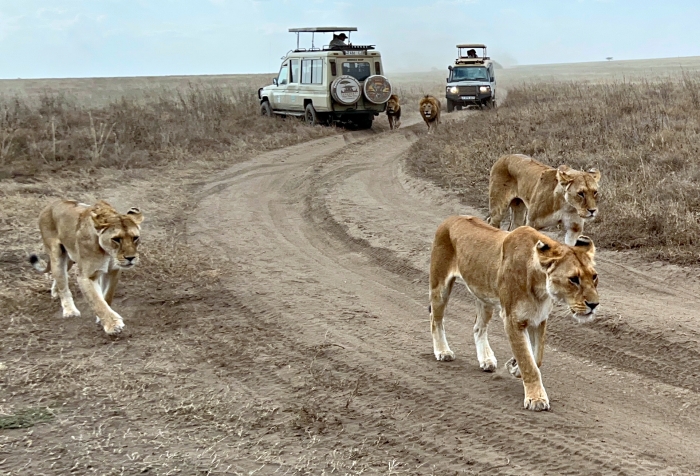 Lions usually hide their cubs when they go hunting and we came upon this pride of six adults who looked like they just came back from an unsuccessful hunt. The four females were leading the way with the two males behind. As they were walking right past our safari vehicle (and a few others which were also present), they called out to their cubs to come out of hiding.