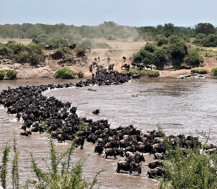I ended up seeing two river crossing of wildebeest (without any zebras crossing) and they were at different sections of a river over two days in the north Serengeti. I also saw an aborted crossing where all of the animals turned and retreated back up the slope. At times there were disorderly bottlenecks when the wildebeest all tried to run back up slopes with some of them slipping or getting pushed back down. After witnessing both the successful crossings as well as the aborted one, I can honestly say that these are the most chaotic scenes I’ve ever seen.