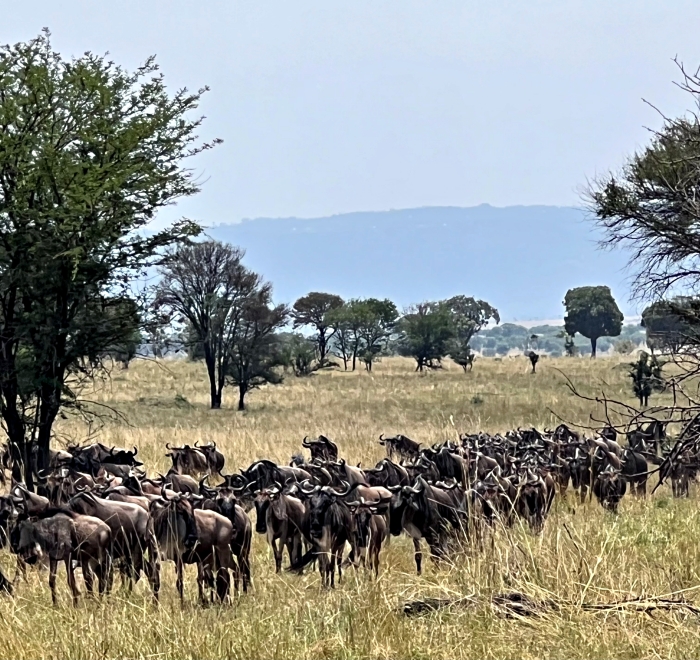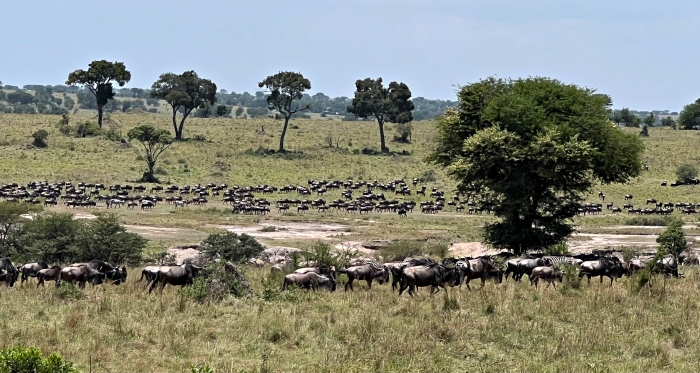 The Serengeti Nation Park is huge enough that different parts of it is affected by season. Each year, masses of wildebeest (or gnu) and zebras migrate from the southern region of the Serengeti during the dry season up north to greener pastures. They end up in the northern Serengeti region and often into Kenya. They return back south for the rainy season when grass becomes green again.